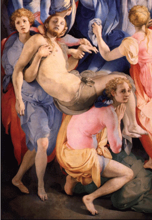 『 十字架降下 』 は多くの画家がテーマにしていますが、ポントルモは、背景のない、浮遊的な空間と色彩を演出しました。 フィレンツェのサンタ・フェリチタ聖堂のカッポーニ礼拝堂に飾られている、マニエリスム様式の傑作です。 絶妙な配置の登場人物は、しかし焦点が定まらず、どことなく虚ろな顔。これは見る者を不安にさせます。人々に身をゆだねるキリストは、ミケランジェロの彫刻 『 ピエタ 』 をほうふつとさせます。