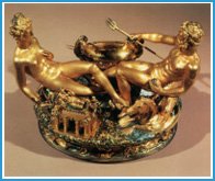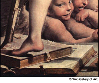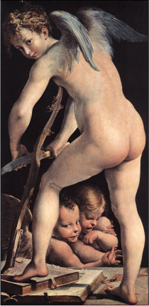 木を削り、弓を作っているのは愛の神キューピッド。彼の左足は、分厚い書物を踏んでいます。 学問を象徴する書物は理性を表すので、この寓意画は、「理性に打ち勝つ愛の力」と捉えることができます。 ただ、その力は永遠に続くのかどうか、わかりませんが…