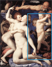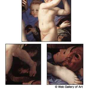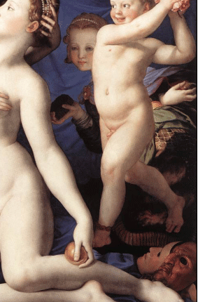 『 愛のアレゴリー(寓話) 』 で、ヴィーナスと息子キューピッドが抱擁しています。その右後ろからのぞいている少女ですが…