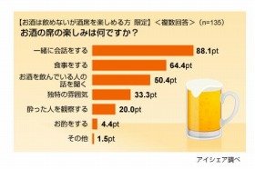 「お酒が飲めない」が「お酒の席を楽しめる」と回答した人に、「お酒の席の楽しみ」を聞いたところ、88.1%が「一緒に会話をする」と回答。「食事をする」(64.4%)、「お酒を飲んでいる人の話を聞く」(50.4%)と続く。お酒を飲んで酔う以外のところで、その場を楽しんでいるようだ。