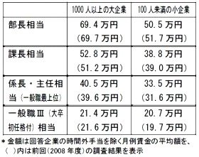 日本生産性本部は2010年4月22日、「能力・仕事別賃金実態調査(2009年)」の中で、等級別・企業規模別の平均月例賃金額(時間外手当を除く)を発表した。回答社数は693社。