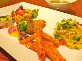 この日のメニューは、魚介のアラで出汁を取って生パスタを浮かべた「マルタリアーティ入 魚介のアラのズッパ(スープ)」、バケットを削ったパン粉と切り落とし肉を使った「色々なお肉の切れ端の一口カツレツ」、手打ちパスタで余った卵白と野菜で作った「卵白のフリッタータ」などが出された。とてもまかない料理とは思えないものばかりだ。