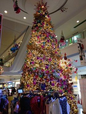 ショッピングモールの巨大なクリスマスツリーはいまだきらびやかに鎮座しており、道にはクリスマスイルミネーションが輝いています。