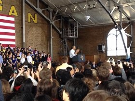 2年前に来たときには3000人規模の会場だったそうですが、今回は何と体育館。ノージャケットで、Yシャツの袖をめくり上げて「汗をかいて熱く語る」スタイルは、今回のトピックでありオバマ大統領の目玉政策のひとつでもある「(州によって異なるが)時給7~8ドル台の最低賃金を10.10ドルにアップする」という内容に完璧にマッチしていました。