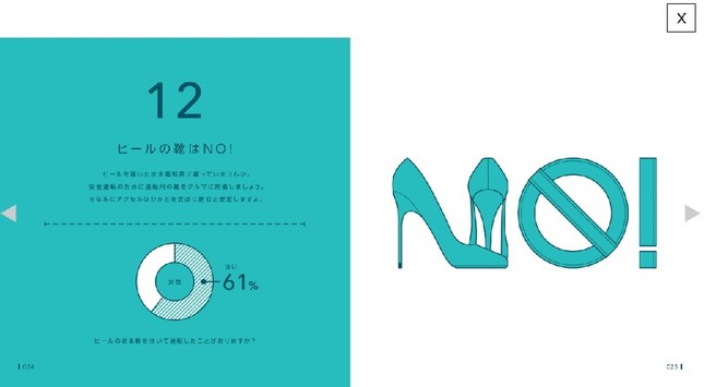 マニュアルは、20〜40代の運転が苦手な女性300人の声をもとに作成された。「ハンドバッグが助手席に座ってませんか(08)」では、荷物が転がり落ちてペダルの奥に入るとブレーキが踏めなくなることがあるため、「小さなハンドバッグでも後部座席やドアのポケットに置くよう心がけて」と注意を促し、「ルームミラーは化粧ミラーではありません(17)」では、「お直しするなら停車中に手鏡で」とアドバイス。「女性の日に運転を控えると答えた女性はたったの5.8%」と数字を挙げながら「自分のカラダとよく相談して運転を(24)」と訴えている。