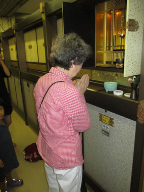 写真はその墓参りの様子である。墓は山の斜面を地下7階くらいまで掘り下げたビルの中にある。長屋式あるいはアパート式といった感じで、鍵を使って上半分の扉を開けると、中は仏壇のようになっている。下半分には骨つぼが入っている。