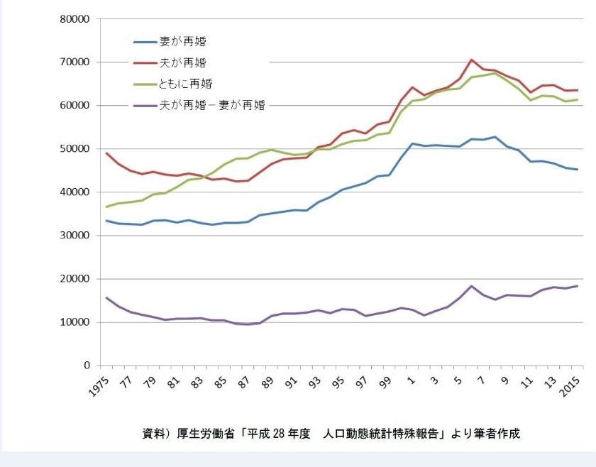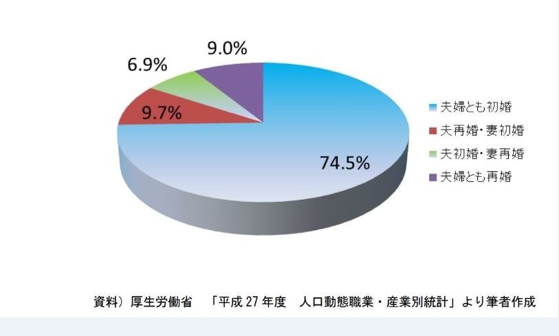 その結果、最新年データではA:夫婦とも初婚(74.5%)、B:夫再婚・妻初婚(9.7%)、C:夫初婚・妻再婚(6.9%)、D:夫婦とも再婚(9.0%)の4つのタイプに分かれた。