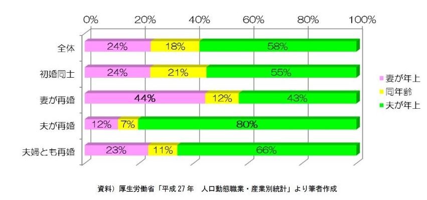 しかも、カップルの年齢差を詳細に調べると、夫が7歳以上の割合が44%と、ほぼ半数が「幼な妻」を獲得する特殊な状態だ。これは犯罪的ともいえそうで、あぶれる男性が出るのも無理はない。一方、妻が再婚・夫が初婚のケースでも、「姉さん女房」の割合は44%に達し(夫が年上は43%)、妻が4歳以上の割合が26%といちばん多く、ほぼ4分の1になった。