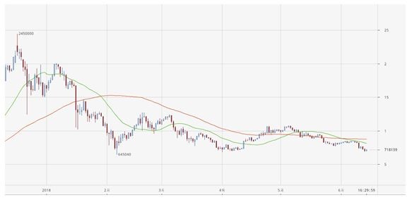 たとえば、2018年1月から4月にかけて、日経平均株価は2万4000円から2万1000円割れまで下落した後、2万3000円まで回復しました=日経平均株価 日足チャート参照。その一方で、仮想通貨市場は低迷したままです=ビットコイン/円 日足チャート参照。
