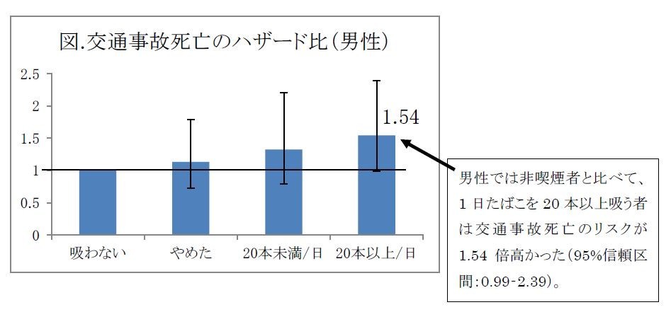これらの住民を、「タバコを吸わない人」「過去に吸ったがやめた人」「1日に20本未満吸う人」「1日に20本以上吸う人」に分けて、死因が「交通事故」の人の割合を比較した。すると、図の「交通事故死亡ハザード比」のように、「吸わない人」の死亡率を1とすると、吸う人の死亡率は右肩上がりに上昇して、「20本以上吸う人」は1.54倍高くなった。