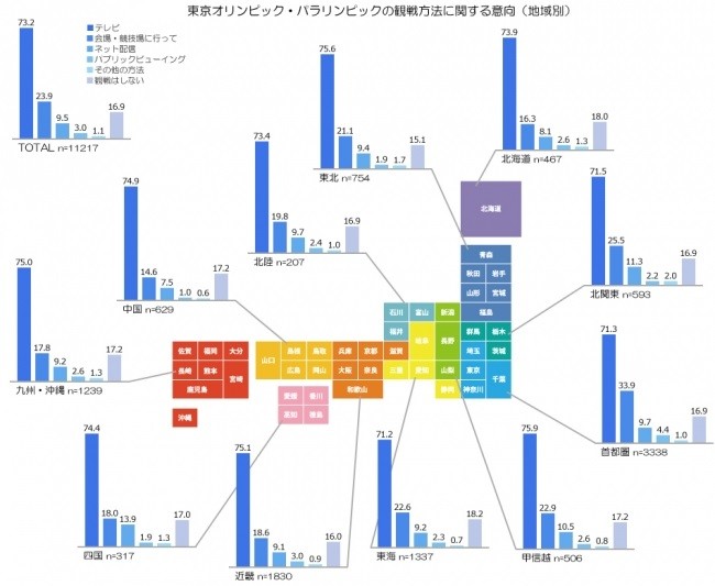 地域別にみると、首都圏では33.9%の人が「会場で観戦したい」と答えたものの、北海道や近畿以西では20%を下回っており、現時点では観戦のために首都圏まで足を運ぶ意向のある人は少ないようだ=別図参照。