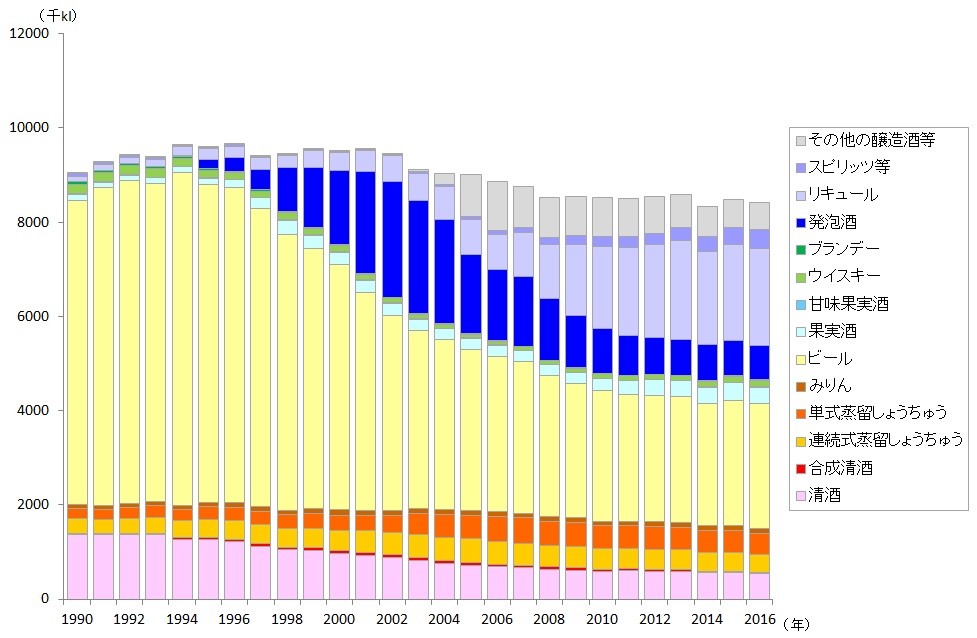 それによると、日本のアルコール市場は1996年をピークに縮小傾向にある=図1参照。また、飲む酒類の中身も変わってきた。飲み屋に入れば、「とりあえずビール」と言って、おしぼりで顔を拭くのが一般的だったのは1990年代半ばまで。当時は、ビールが全体の7割を占め、2位の清酒と合わせると全体の8割を超えていたが、90年代後半からはビールや日本酒が減少する一方、発泡酒やリキュール、そのほかの醸造酒などが増え、多様化している。