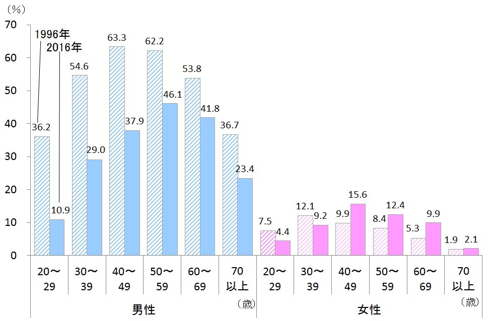 その飲酒習慣率が、20代男性では、1996年の36.2%から2016年には10.9%に激減している。なんと3分の1以下だ。飲み盛りの40代でも63.3%から37.9%へ、50代でも62.2%から46.1%に減っている。