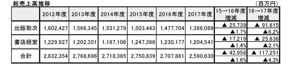 出版取次業者や書店経営者などの出版関連事業者の2017年度の総売上高は、前年度と比べて4.3%減の2兆5906億3000万円となり、2年連続の減収となった。帝国データバンクが、12年度から17年度までの売上高が判明した出版関連業者2172社を調査した。18年9月21日の発表。
