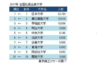 企業情報の東京商工リサーチの「2017年の全国社長の出身大学」調査によると、社長の出身大学のトップは日本大学の2万2183人で、調査開始から8年連続の断然トップを守った。2018年10月9日の発表。