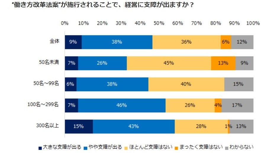 働き方改革関連法が施行されることで、「経営に支障が出るか」を聞くと、半数近くの47%が「支障が出る」(大きな支障が出る=9%、やや支障が出る=38%)と答えた。