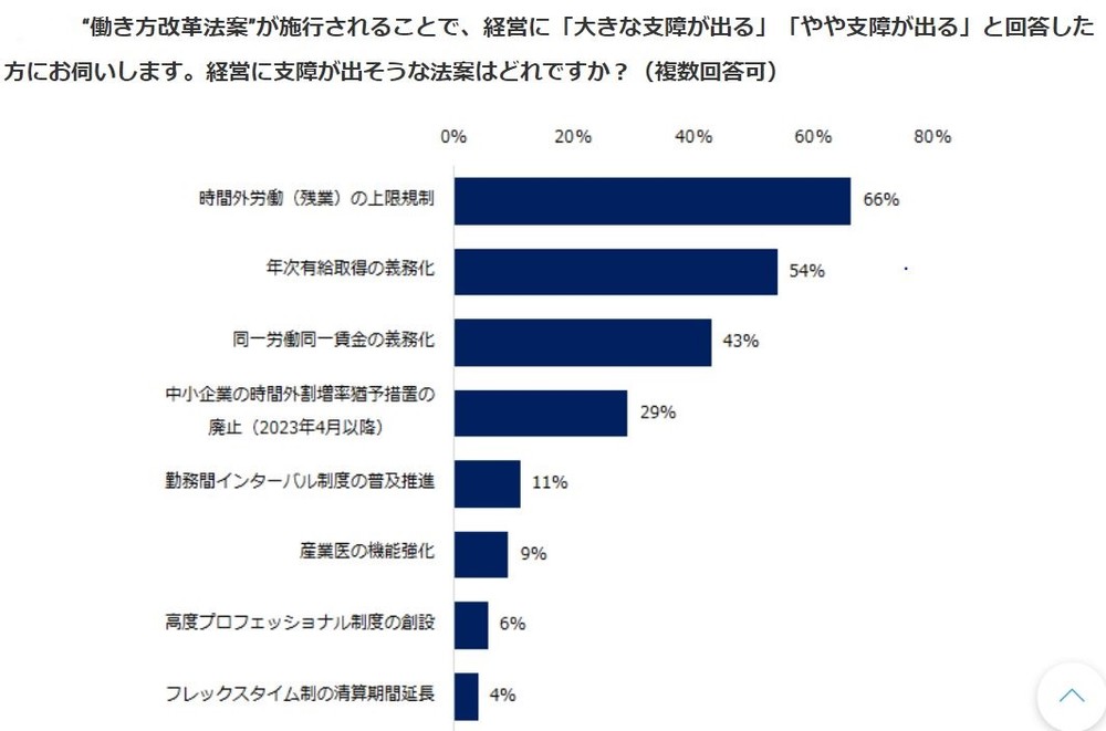 「経営に支障が出る」と答えた企業に、どの内容が問題なのかを聞く(複数回答)と、第1位は「時間外労働(残業)の上限規制」で66%だった。