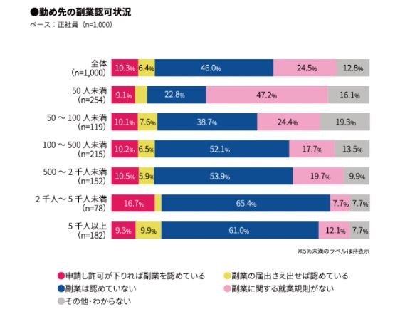 また、従業員数が少ない企業では、そもそも「副業規則がない」というケースが多いようで、「50人未満」の企業に勤める正社員のうち47%がそれに該当していた。