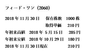 米中間選挙の結果は、上院と下院で多数派が別れる「ねじれ国会」となった。そのおかげで、トランプ政権は貿易政策を推し進めることも多少は難しくなったと見受けられる。そのため、貿易関税もあまり上がらないと考えて、今回は食品系の中でも畜水産物や配合飼料などを取り扱っている「フィード・ワン」(2060)を選んだ。