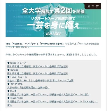 「ICHIGEI」を企画した早稲田大学広告研究会の田中龍之介さんは、「一芸を持った者なら、自分の力に自信を持っていいはず」とコメント。11月13日に、その第1弾を開いた。学生と企業が提案する「新しい就職のカタチ」として、ニュース番組にも取り上げられるなど大きな反響を呼び、今回は早稲田大学から全国へと規模を拡大して開催する。