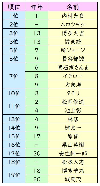 男性のトップはお笑いコンビ、ウッチャンナンンチャンの内村光良さん(54)、女性は日本テレビの水ト麻美アナウンサー(31)がともに3連覇した。その一方で、トップ3の常連だった池上彰さん(68)やタモリさん(73)がダウン。どうやら、地殻変動が起こっているらしい。