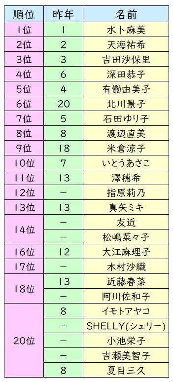 女性の3位は、3年連続で吉田沙保里(36)さん。また現在、TVドラマやCMなどで活躍している深田恭子さん(36)や北川景子さん(32)、米倉涼子さん(43)などが順位を上げてトップ10内にランクインした。