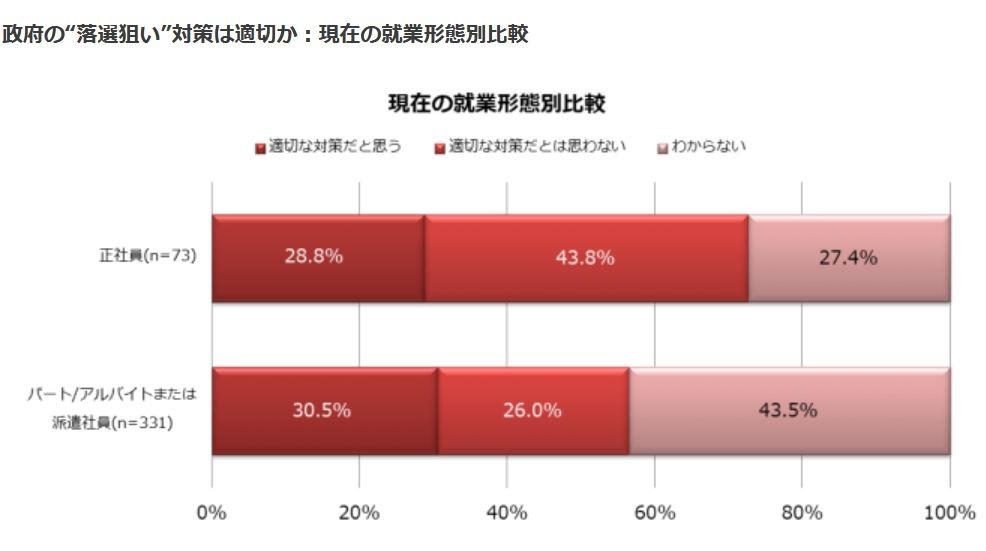 また、政府の「落選狙い対策は適切と思うかどうか」を聞くと、「適切と思う」とする人が30.8%、「適切と思わない」とする人が27.8%と、ほぼ賛否両論が拮抗した。しかし、この回答を「正社員」と「非正規社員」(パート・アルバイト・派遣社員)に分けて分析すると、正社員は「適切と思わない」が43.6%(『適切と思う』が28.8%)と批判的な人が多くなった。一方、非正規社員は「適切と思わない」が26.0%(『適切と思う』が30.5%)と容認する人が多くなり、真逆な結果となった=図表3参照。