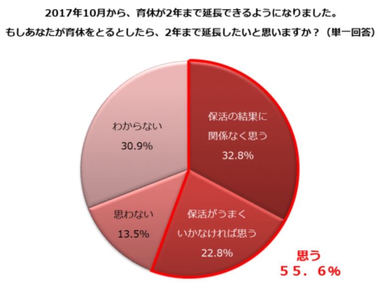 まず、「育休をとるとしたら2年まで延長したいと思うか」を聞くと、「保活(保育所への入所活動)の結果に関係なく思う」と「保活がうまくいかなければ思う」を合わせて55.6%の人が「思う」と答えた。「思わない」と答えた人は13.5%だけだった=図表1参照。育休をとるなら2年とりたい人が6割近くいるわけだ。