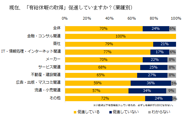 「現在、有給取得を促進しているか?」という問いには、全体の70%が「促進している」と回答。業種別に積極性をみると、「金融・コンサル関連」(100%)「商社」(79%)「IT・情報処理・インターネット関連」(77%)が上位に並んだ。積極的とはいえないことが示されたのは「広告・出版・マスコミ関連」(36%)「流通・小売関連」(34%)「不動産・建設関連」(27%)。