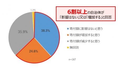 調査によると、改正地方税法が寄付額に与える影響について、35.9%の自治体が「寄付額が減少すると思う」と回答。その一方で、「寄付額に影響はないと思う」が38.3%、「寄付額が増加すると思う」が24.6%と、6割以上が「影響はない」「増える」と答えた=下グラフ(1)参照。