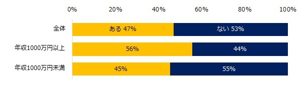 調査によると、「これまでリカレント教育を行ったことがありますか?」の問いに、47%が「ある」と回答。年収別にみると、「1000万円以上」の56%が「ある」と答え、「1000万円未満」では45%だった。