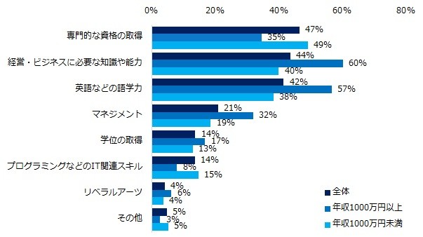 「ある」と答えた人たちの具体的な学習の内容で最も多かったのは、「専門的な資格の取得」の47%。次いで「経営・ビジネスに必要な知識や能力」の44%、「英語などの語学力」が42%だったで、これらがトップ3。しかし、1000万円をボーダーにした年収別の回答をみると、「専門的な資格の取得」は「1000万円未満」の人たちで割合が高く49%、「1000万円以上」では35%と対照的。「経営・ビジネスに必要な知識や能力」と「英語などの語学力」では、それぞれ「1000万円未満」が40%と38%、「1000万円以上」が60%と57%だった。