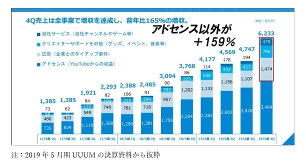 特に2019年5月期4Q(3月~5月期)は、グーグル・アドセンス以外の売り上げが、前年と比べて59%アップと非常に強い伸びをしている。これは、企業とのタイアップ案件が拡大していることや、人気ユーチューバーたちのグッズやイベントなどの売り上げの貢献が大きい。