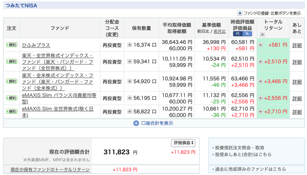 評価額が31万1823円なので含み益が1万1823円でているという状況です。また投資額の30万円のうち、18万円ほどはポイントで購入しています。日常のお買い物で貯めたポイントを投資で増やせていることになりますね!