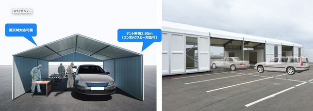 テントは軽量で持ち運びが容易。病院内敷地や道路上など場所を問わずに設置できる。また来院者の規模、設置場所などの状況に応じた調整にも応じられ、車両検査窓口を増やすこともできる。