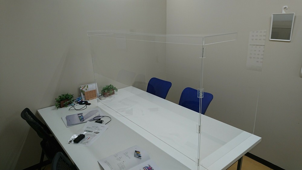 政府の緊急事態宣言でテレワークを導入する企業が増えている一方、企業や職場によっては多くの従業員が出勤せざる得ないケースがある。「シェルター」は、そうした場合の飛沫対策に有効。ムーブオンは大型材料加工機を所有しており、オーダーに合わせた設計、制作が可能という。