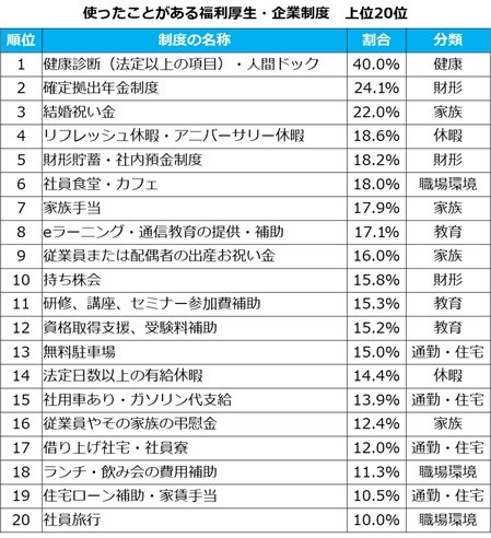 一方、使ったことがある制度について聞くと、1位は「健康診断(法定以上の項目)・人間ドック」で40.0%の人が答えた。2位は「確定拠出年金制度」で24.1%、3位が「結婚祝い金」の22.0%だった=下図参照。