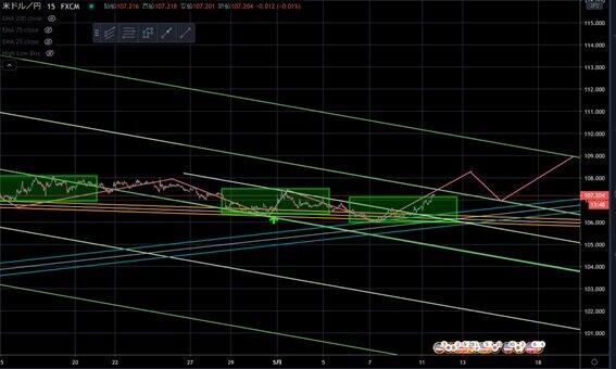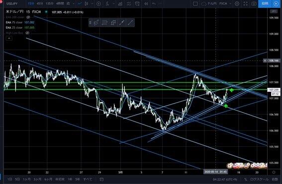 夜中に引いていたトレンドラインにタッチしてきており、昨夜とは違い形が綺麗だったので、ここで反発したら1米ドル=107.250円付近まで行くという自信が強く持てた。