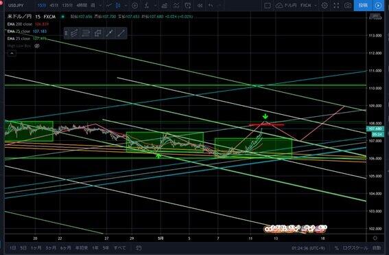 朝起きて確認したところ、1米ドル=107.75円あたりで反落していたので、指値には届いていなかった......。そこでまた線引きを多少見直してから、指値を一度消して様子を見ることにした。1米ドル=107.00円あたりまで戻ってくるなら、一度決済してしまおうと思う。上にまた伸びるようなら、1米ドル=108.40円あたりで利益を確定したい。