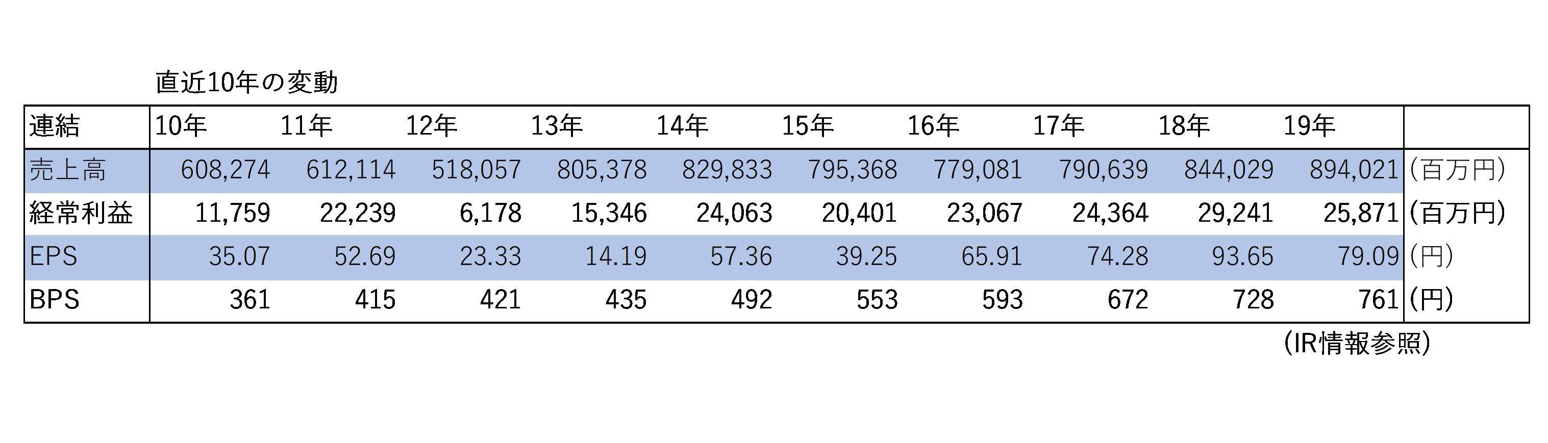 直近10年の売上高、経常利益、1株当たりの当期純利益(EPS)、1株当たりの純資産(BPS)は下表1のように推移。順調に売上高、利益を伸ばしていることがわかり、EPSも増加しています。それに伴い、BPSも堅調に増えていることがわかります。