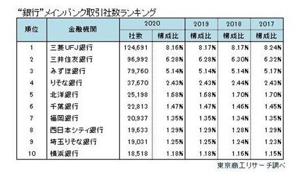 全国152万8043社のメインバンクは、三菱UFJ銀行が12万4691社(シェアで8.1%)で、調査開始以来、8年連続でトップを守った。企業信用調査の東京商工リサーチが調べた。2位は三井住友銀行の9万6992社(同6.3%)、3位はみずほ銀行の7万9760社(5.2%)、4位はりそな銀行の3万7670社(2.4%)、5位は北海道の第二地方銀行、北洋銀行の2万5198社(1.6%)と続いた。