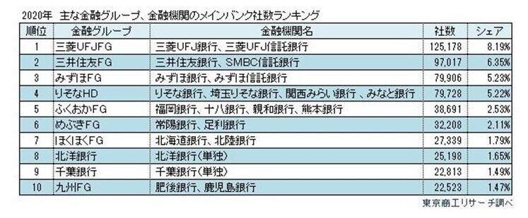 調査によると、全国152万8043社のメインバンクは、銀行は上位を3メガバンクと、りそな銀行が独占。続いて、第二地銀トップの北洋銀行が続き、千葉銀行(2万2813社、シェア1.47%)、福岡銀行(2万937社、同1.35%)が逆転をうかがう。