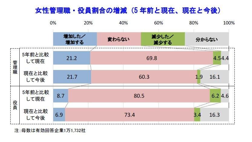 女性役員をみると、5年前と比べて「増加した」企業は8.7%、今後「増加する」と考えている企業は6.9%で、前年から0.7 ポイント減った。「変わらない」とする企業は73.4%と、7割超え=下図参照。