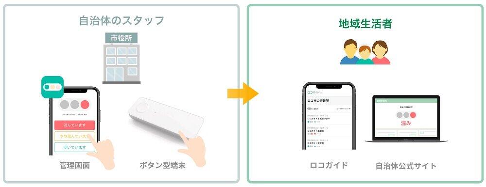 施設や店舗からの情報発信が容易にできる専用のスマートフォンアプリのほか、スマホがない環境でもボタンを使って情報発信ができる端末を使って「状況」を発信できる。全国の小売店のほか、自治体窓口や観光・宿泊施設、またレジャー施設、スタジアムなどで導入されている。大阪府の自治体では、豊中市が初めて。