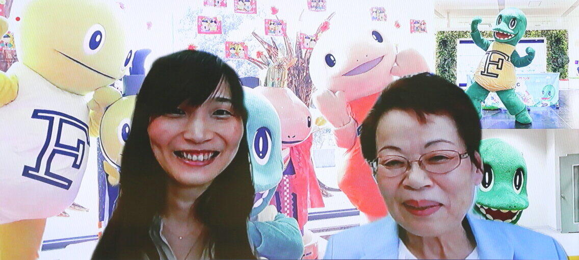 杉下左和さん(左)と田村洋子さん。田村さんは、全国地域婦人団体連絡協議会常任理事も務める。背景に見えるのは、福井県のマスコットキャラクター「Juratic(ジュラチック)」。