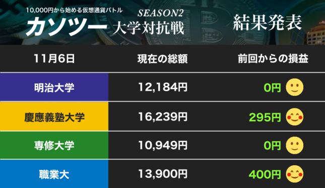 果敢に攻めたのが、職業能力開発総合大学校のさっちん。しっかりプラスを積み上げ、トップを走る慶応義塾大学を追う。その慶大の馬医金満はビットコインを保有したまま、売りのタイミングを計る。