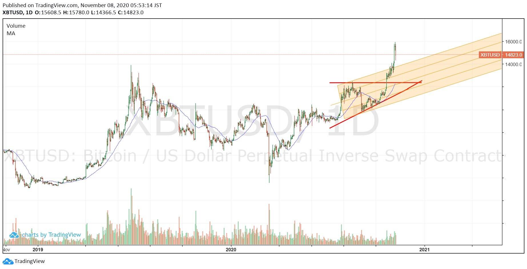 しかし、11月7日深夜、さすがに調整が入り、この記事を書いている現在の時点(11月8日5時)では1万4645ドルまで値が落ちました。この調整がある程度終わり、再び上昇を始めた頃に、買いポジションに入りたいと思います。