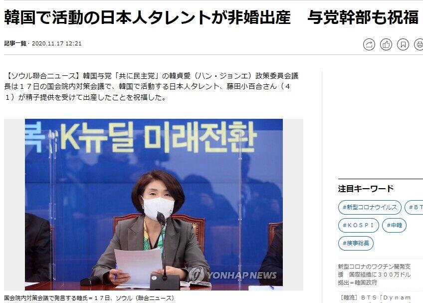 このため、サユリさんの行動を称賛する声が、文在寅大統領の与党「共に民主党」の女性幹部たちからも巻き起こった。聯合ニュース(2020年11月17日付)「韓国で活動の日本人タレントが非婚出産 与党幹部も祝福」が、こう伝える。