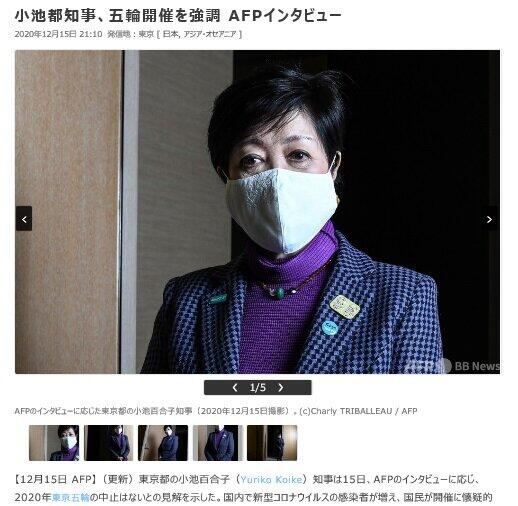 AFP通信(日本語版オンライン)は2020年12月15日21時10分「小池都知事、五輪開催を強調」というインタビュー記事を配信した。国内で新型コロナウイルスの感染者が増え、国民が開催に懐疑的になっている中で、小池都知事の発言を次のように紹介した。