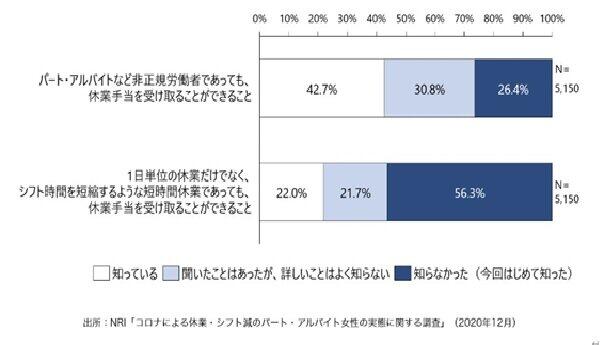 新型コロナウイルスの感染拡大に伴って仕事(シフト)が減った際に勤め先から休業手当を受け取れない場合、労働者本人が申請すれば受け取れる「休業支援金」や「給付金」があることについて、シフトが減ったパートやアルバイトの女性に聞いたところ、「知っている」と答えた人は16.1%で、59.2%が「知らなかった」と回答したことが、野村総合研究所(NRI)の調べでわかった。2020年12月29日の発表。